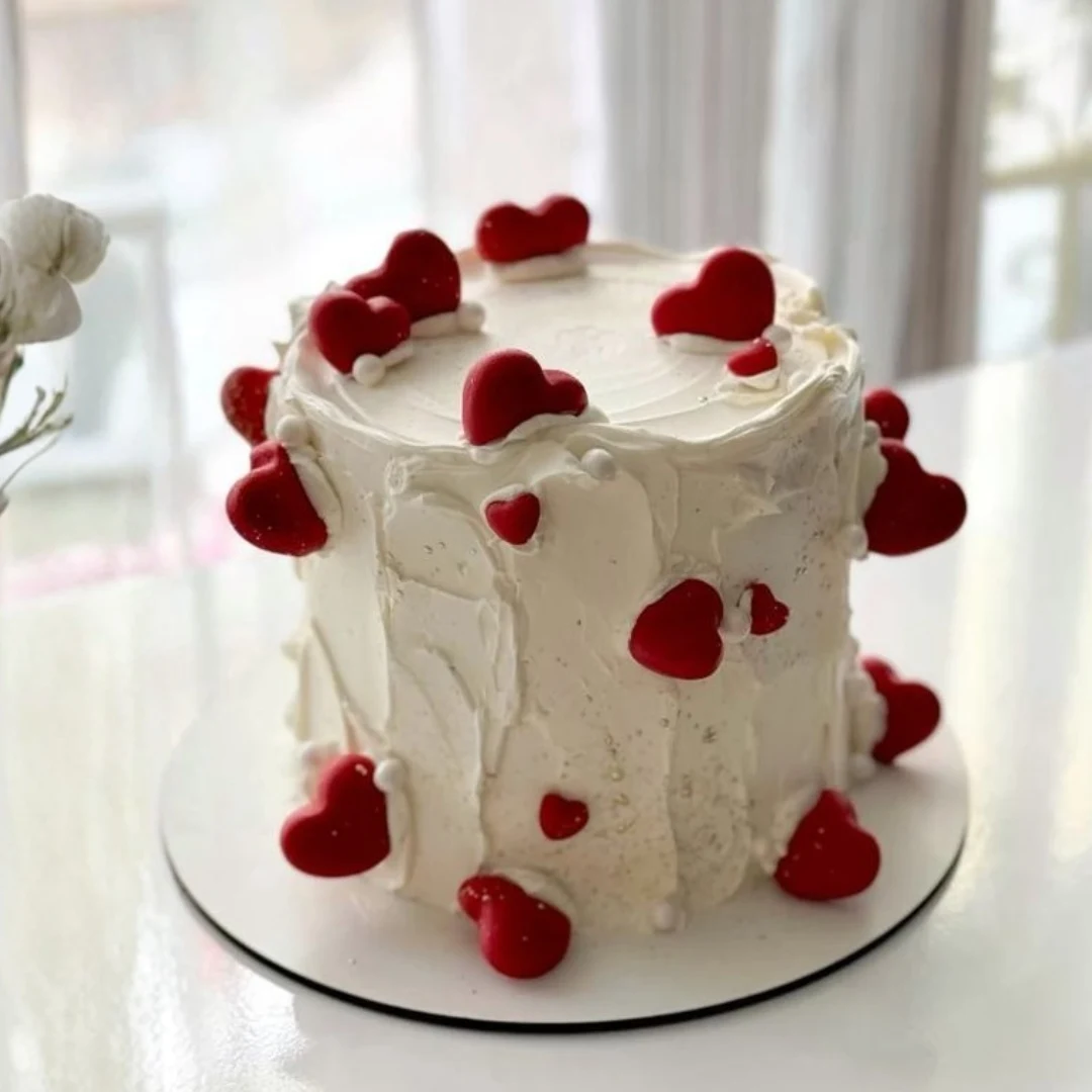 Blush & Bliss Cake – a tall, elegant eggless cream cake decorated with adorable red hearts and soft white textures, made for celebrating love-filled moments. Simple, sweet, and fully customisable in flavour and décor to suit any occasion.