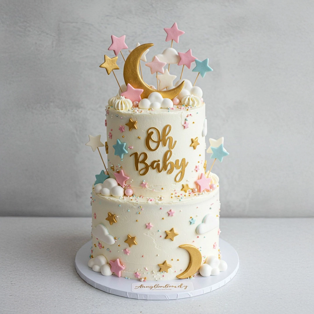 Welcome your little star with our Moon & Stars Welcome Cake, a dreamy 2-tier eggless cream cake in pure white, adorned with delicate moons and stars. Perfect for a baby shower, this elegant creation can be customised to reflect your unique style and make the celebration truly magical.
